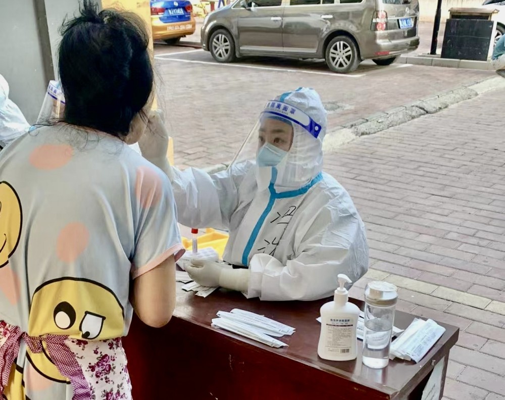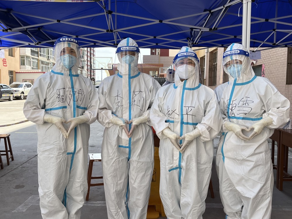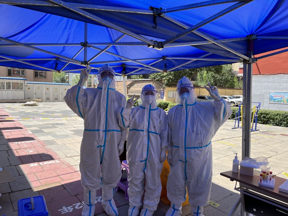 行驶途中领队李莉副主任组织队员们进行分组,认真学习各项感染控制措施及隔离衣的正确穿脱,到达社区后全体队员立刻投身于核酸采集工作。八月的乌兰察布,除了闷热的空气和毒辣的太阳,还有那毫无征兆突然间倾泻而下的大雨,尽管如此也无法阻挡医疗队的热血与激情。