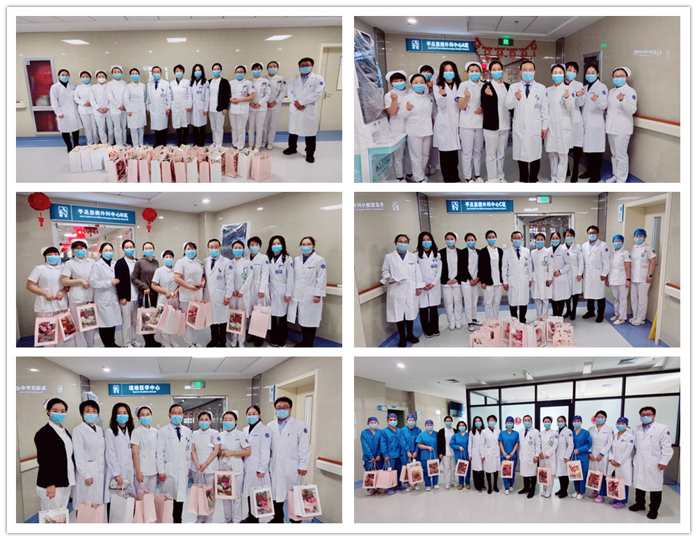 慰问中,院领导一行与女职工们亲切交谈,详细了解她们的工作和生活情况,对她们的辛勤付出表示感谢,向她们送上了鲜花和节日祝福,并通过医务部、护理部向91直播外派支援呼和浩特市疫情防控工作的医疗队员表示崇高的敬意。同时,希望广大医护人员们切实加强自我防护,在繁忙的工作中继续贡献巾帼力量。