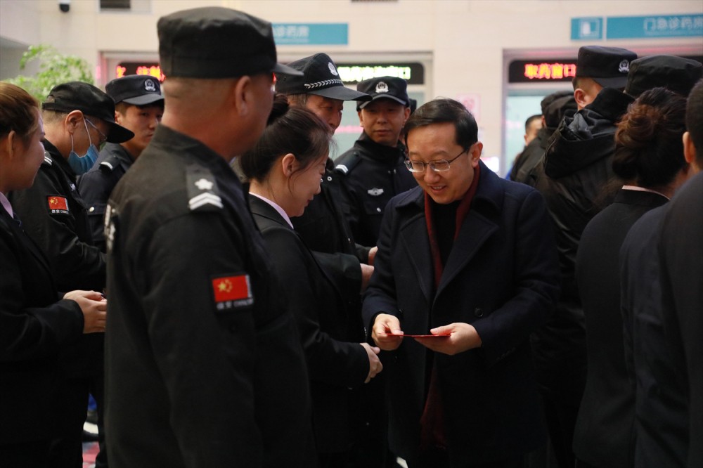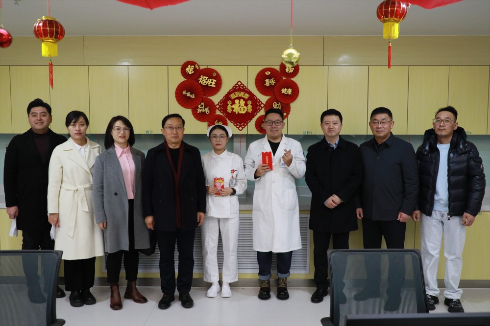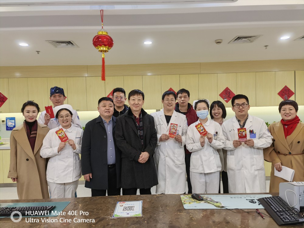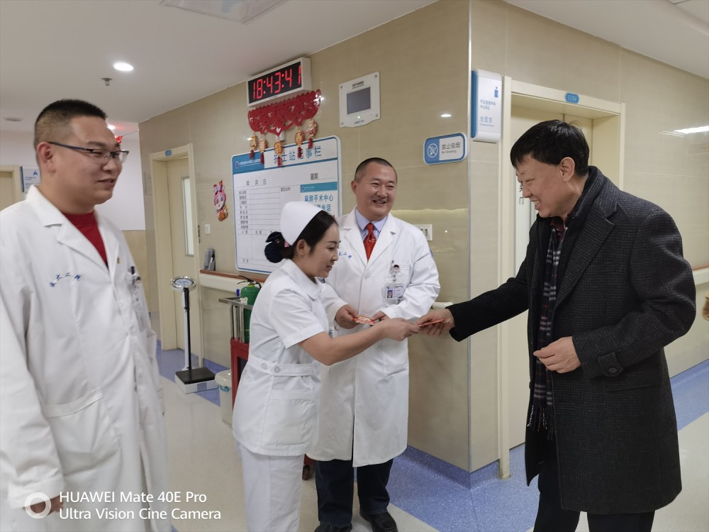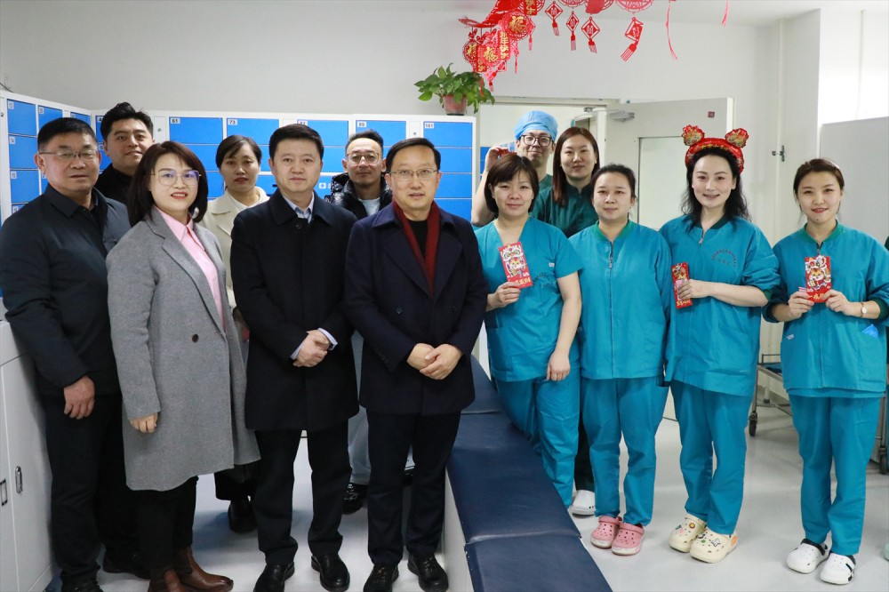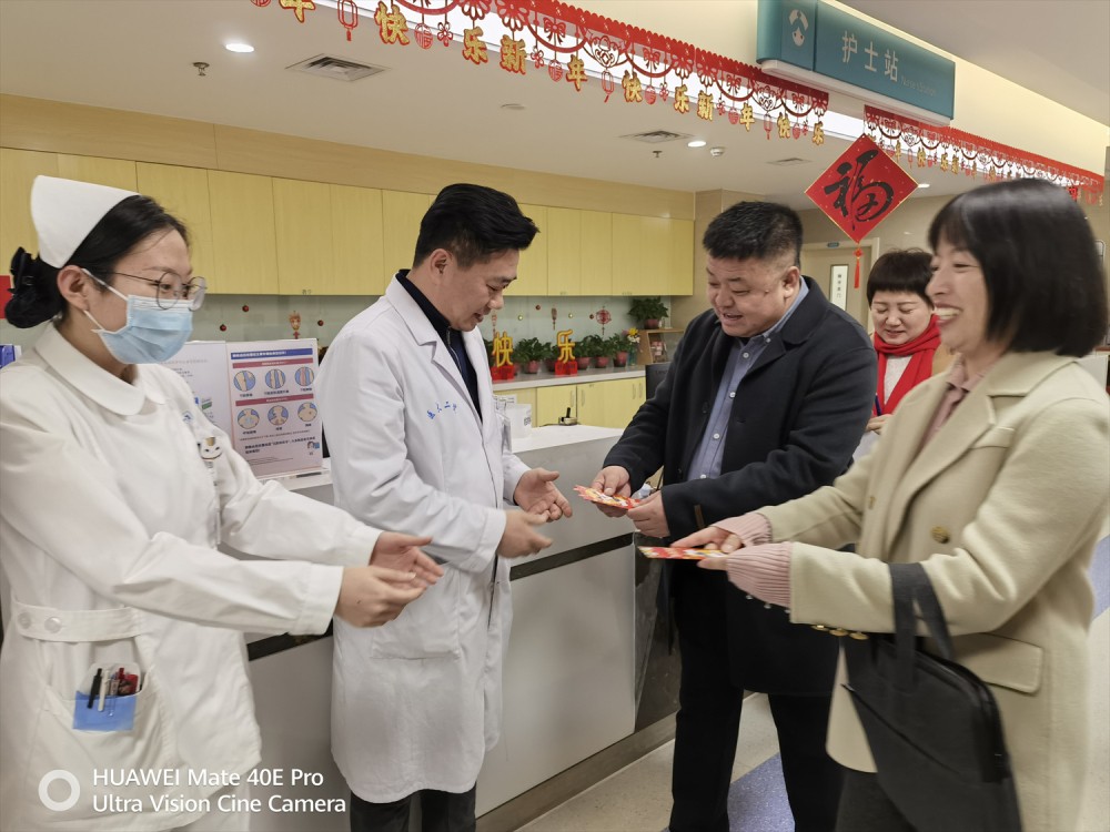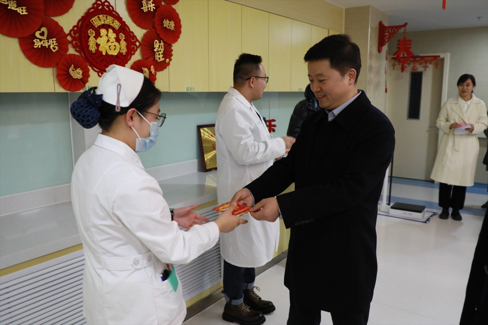 2月9日除夕夜,党委书记刘万林,党委副书记、院长邱颐,党委副书记赵岩,党委委员、纪委书记跟锁,党委委员、副院长冯卫带领部分职能科室负责人分三组深入临床、医技和后勤保障一线,看望慰问节日期间仍然奋战在一线岗位上的工作人员,向他们致以诚挚问候和新年祝福。
