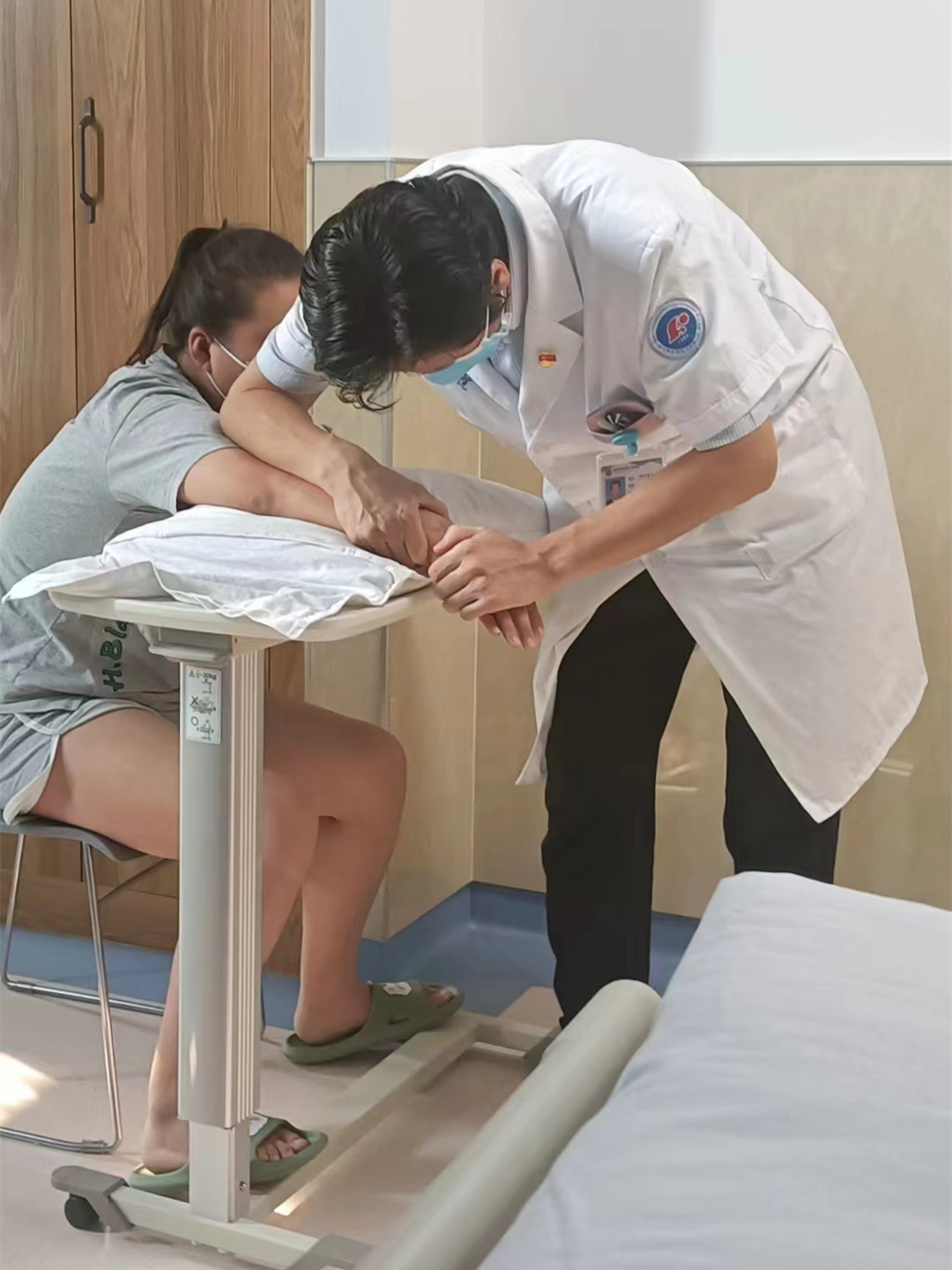 科主任阿日嘎太原本想利用这个假期陪伴年迈的父母,享受难得的团圆,面对此种情况,他在第一时间返回工作岗位,统筹安排全科工作,一方面叮嘱被封控的医生做好防护,注意安全;另一方面带领科里年轻医生留守病房。为了减少住院患者外出去治疗区做理疗时可能存在的感染风险,他迅速安排科室将治疗区可移动的理疗设备全部转移到病房,带领科室的工作人员为患者开展床旁理疗。在康复治疗中心,康复治疗师的手法治疗对于患者的功能恢复起着至关重要的作用,为了保证患者的康复治疗效果,阿主任不仅每天根据每个患者的病情调整康复治疗方案,保证医疗安全,同时还承担手法治疗和针灸治疗的工作。