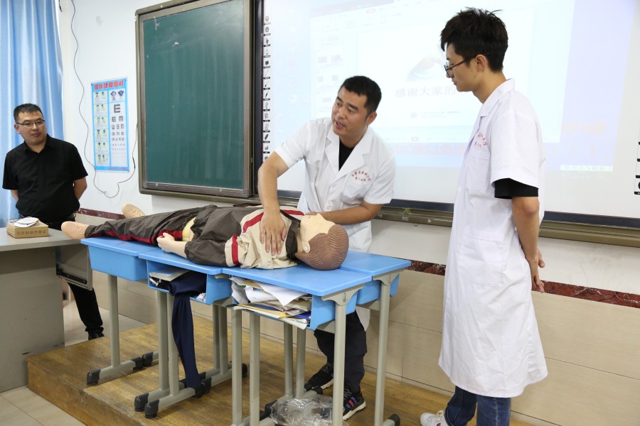 此次培训活动内容主要分为两部分:理论学习与实操练习。首先由吴育林医师向到场的55名学生讲解心肺复苏的基础知识及心肺复苏技术培训的重要意义,然后由付学强医师讲解院外心肺复苏技术的标准流程及注意事项。最后由王威医师现场演示心肺复苏流程、自动体外除颤仪的使用。随后,学员分组进行学习交流与实操练习。