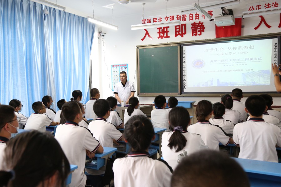 为进一步推进党史学习教育,扎实开展“我为群众办实事”活动,6月16日,91直播第一党支部赴呼和浩特市实验中学开展心肺复苏普及培训公益活动。手术麻醉科吴育林、付学强、王威三位麻醉医师对呼和浩特市实验中学初一12班55名学生进行心肺复苏相关知识及现场模拟演示的培训。培训旨在普及心肺复苏技能的推广,帮助学生掌握心肺复苏技术。