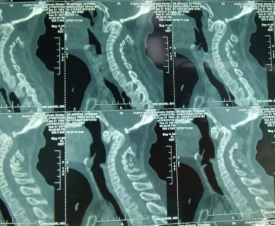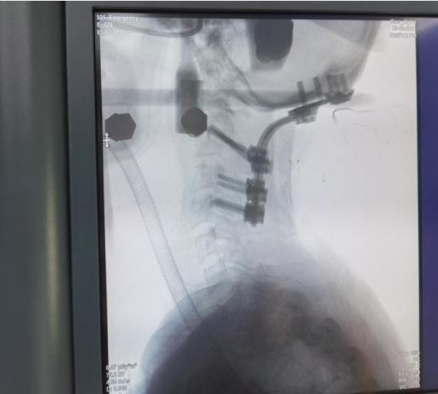 寰枢椎脱位,需尽快手术,否则神经功能会持续恶化,甚至危及患者生命。而此位患者特殊性在于寰椎前脱位、前倾,后弓突入枕骨大孔,颈脊髓受压变性,患者又不耐受大重量牵引复位,手术操作范围主要是在枕骨大孔处,此处是延髓生命中枢的延续,稍有失误将会导致灾难性的后果。张沛主任深知该类手术的复杂性和危险性,但是面对患者及家属坚定而又信任的目光,他决定和患者一同跨越这个难关。