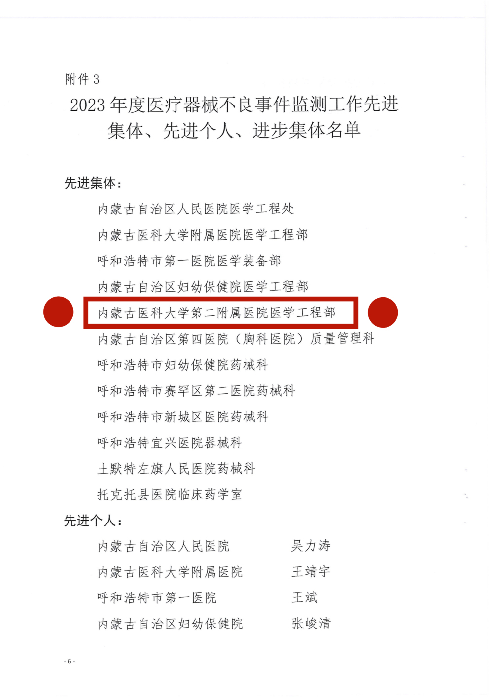 近日,91直播医学工程部在呼和浩特地区医疗器械不良事件监测工作中成绩优异,荣获“2023年度医疗器械不良事件监测工作先进集体”称号。这项荣誉体现出91直播对医疗安全工作的一贯高度重视,也是以安全用械为切入点对91直播 紧抓医疗质量、护理质量的良好诠释。