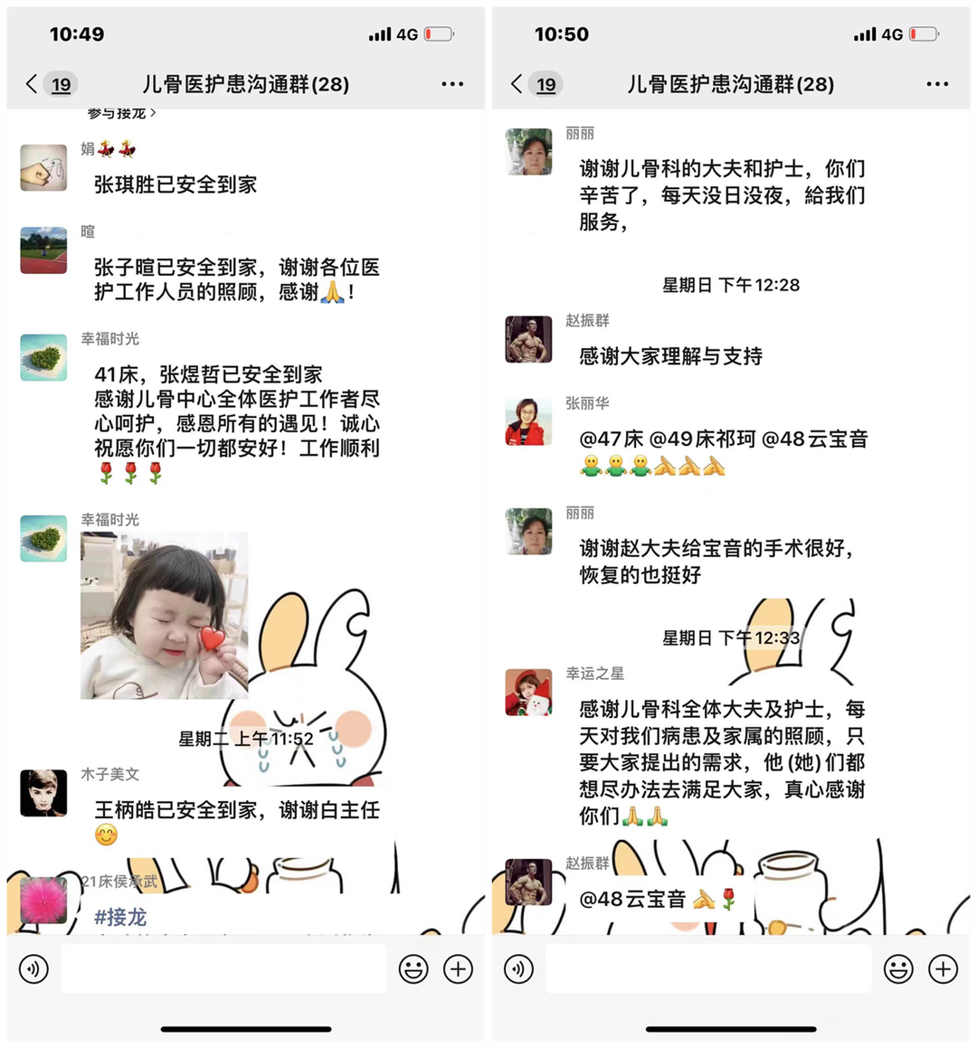 疫情期间,在儿童骨科医学中心副主任白锐和护士长张丽华的带领下,我们第一时间建立了“儿骨护患沟通群”,方便患儿家长提出需求,我们可以及时看到并提供帮助。国庆假期结束,有一位小患者需要上网课,可是没有带书包等学习用品,护士长了解情况后立即进行协调,医院保安将小朋友家人送来的书包安全送到病区,护士长贴心地为小朋友安排了一个房间给他上网课,解决了患儿及家长的燃眉之急,家长也特别感动,连连称赞医院的人性化管理和服务暖人心。在办理出院时,有的患儿家长联系不到当地疾控中心,副主任白锐和护士长张丽华在第一时间帮忙联系,了解当地政策后积极帮助家长沟通,直到他们平安到家才放心,并随时在微信群里关注这些出院患儿的动态,对他们出院回家后遇到的问题进行指导。在副主任白锐和护士长张丽华的合理安排下,儿童骨科医学中心所有的工作井然有序,正常进行。每一位医护人员心系患儿,舍小家为大家,正因为这份爱与奉献,才得到了患儿与家长的认可与感谢。